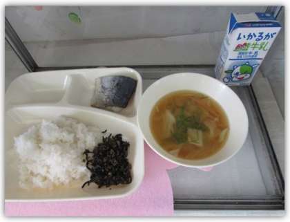 本日の給食の献立をご紹介します。本日の献立は、ご飯、牛乳、さごしの塩焼き、みそ汁、牛ひじきそぼろでした。