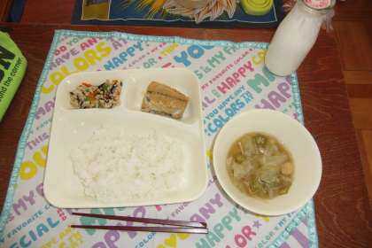 今日の給食の献立をご紹介します。今日の給食は、ご飯、サゴシのしょうゆだれかけ、すまし汁、高野豆腐の炒り煮、牛乳です。サゴシは、サワラの幼魚で、主に関西以西での呼び名です。サワラは成長に応じて呼び名が変わる出世魚の一つで,関西では50cmくらいまでの若魚をサゴシ,70cmくらいまでをヤナギ,70cmを超すとサワラと呼ばれます。東京では若魚をサゴチというそうです。