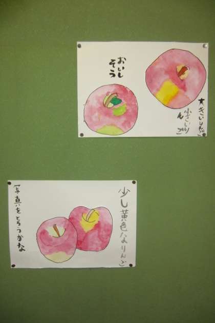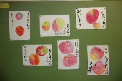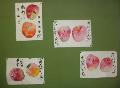 出来上がった作品を並べて互いに鑑賞し、「わあ、本物のリンゴみたいだ。」と、喜んでいました。