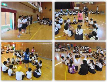 木曜日の朝、児童雌雄会の様子をご紹介します。今日は集会委員会による『ジェスチャーゲーム』です。リーダーが、指示カードにあるものをジェスチャーで表現し、チームのみんなで当てていきました。