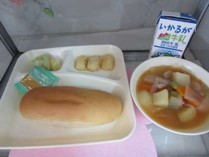 本日の給食の献立をご紹介します。本日の献立は、コッペパン、牛乳、りんごジャム、いか天ぷら、フレッシュトマトのスープ煮、サワーソテーでした。