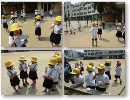 1年生の生活科の学習です。運動場で、シャボン玉を飛ばしました。初夏の青い空に、シャボン玉はキラキラと光りながら飛んでいきました。