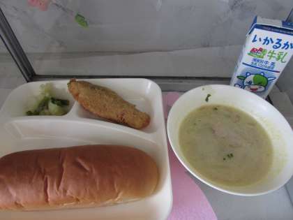 本日の給食の献立をご紹介します。本日の献立は、黒糖パン、牛乳、サーモンフライ、豆乳スープ、キャベツとさんどまめのサラダでした。