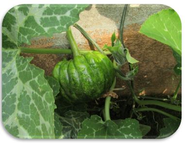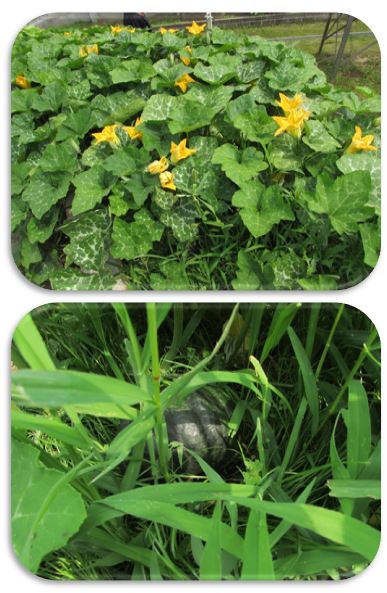 5年生が学習園で育てている勝間南瓜です。いくつかの実は、大きくなってきました。
