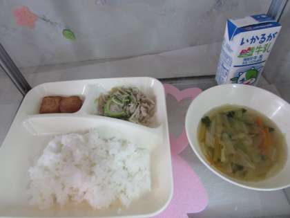 本日の給食の献立をご紹介します。本日の献立は、ご飯、牛乳、ゴーヤチャンプルー、すまし汁、厚揚げのしょうが醤油かけでした。