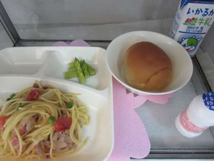 本日の給食の献立をご紹介します。本日の献立は、黒糖パン(小)、牛乳、ポークトマトスパゲッティ、グリーンアスパラガスのサラダ、発酵乳でした。