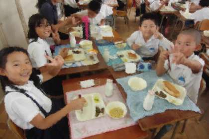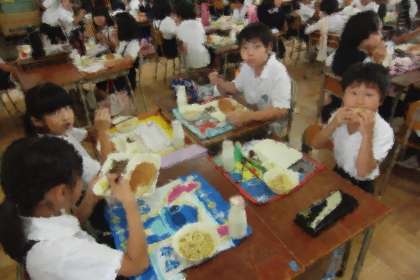 スパゲッティを甘い黒糖パンにはさんで食べる子どもも、多くいました。3年生の子どもたちも、にこにこ笑顔でいただきました。