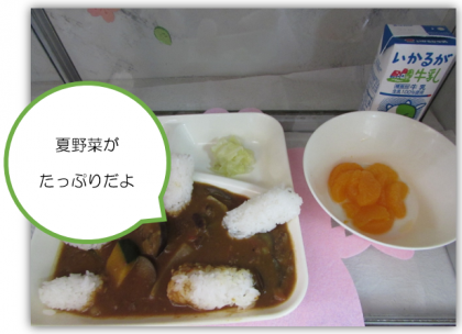 本日の献立は、夏野菜のカレーライス、牛乳、キャベツのサラダ、缶詰のみかんでした。