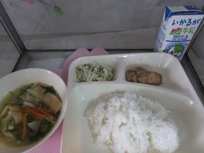 本日の給食の献立をご紹介します。本日の献立は、ご飯、牛乳、鶏肉のしょうゆマヨネーズ焼き、五目汁、切り干し大根の柚子の香り和えでした。