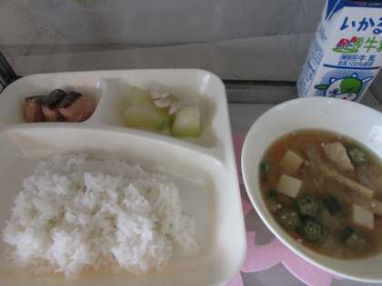 7月17日(水) 本日の給食の献立をご紹介します。ご飯、牛乳、サケのつけ焼き、みそ汁、冬瓜の煮物でした。