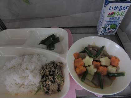本日の献立は、ご飯、牛乳、豚肉とじゃがいもの煮物、オクラの甘酢和え、ツナっ葉炒めでした。