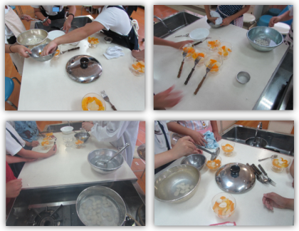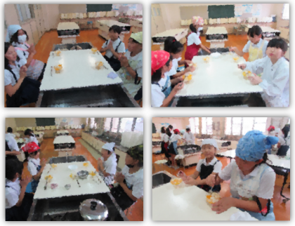 画像は、料理クラブの活動の様子です。今日は、缶詰のフルーツと、白玉、サイダーを使って、「フルーツ白玉ポンチ」を作りました。