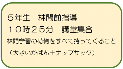 本日の5年生の林間前指導は、10時30分より講堂で行います。5年生は10時25分までに講堂に集合しましょう。
