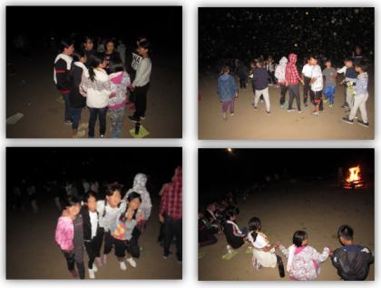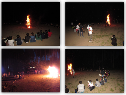 キャンプファイヤー。楽しいゲームや歌で、盛り上がりました。