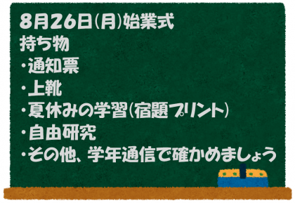 楽しかった夏休みももうすぐ終わり、8月26日(月)2学期が始まります。各学年だよりで確かめ、2学期の準備をしましょう。