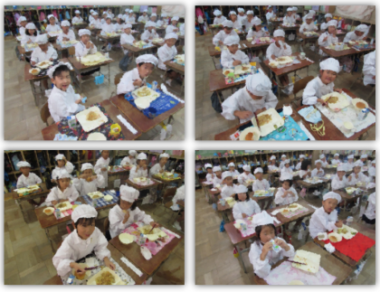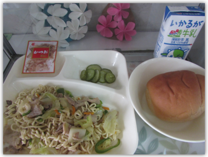 本日の給食の献立をご紹介します。本日の献立は、黒糖パン(小)、和風焼きそば、きゅうりの柚子風味、牛乳でした。