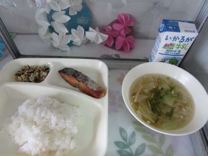 本日の給食の献立をご紹介します。本日の献立は、ご飯、牛乳、サケのしょうゆ風味焼き、五目汁、高野豆腐の炒り煮でした。