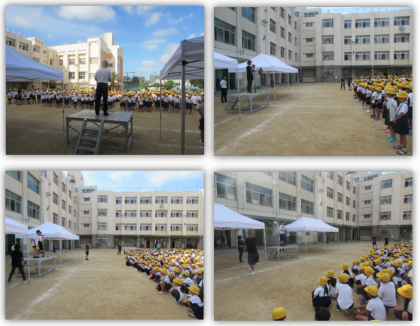 初めに、学校長からの話です。「先週、天下茶屋であった事件の犯人は捕まったそうです。けれども、今後も帰るときには近くの人と帰りましょう。また、自分の身を守るためにも朝の遅刻をなくしましょう」「先日、雷が鳴っているときに運動場に出ている人がていました。大阪市内の学校で、雷の振動で窓ガラスが割れ、けがをした人がいるそうです。雷が鳴っているときには、運動場に出ないようにしましょう。」「これからしばらく、運動会が終わるまでの間、全校朝会はありません。運動会で練習の成果をしっかりと発揮できるように、水分をきちんと補給し、安全に練習に取り組むようにしましょう。」と、話しました。