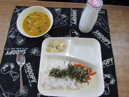 今日の給食をご紹介します。今日の献立は、かやくご飯、みそ汁、白菜の柚子風味、牛乳でした。