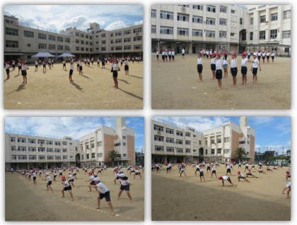9月12日(木) 5年生の体育の学習です。運動会に向けて、団体演技の練習に取り組んでいます。
