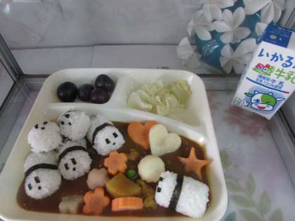 本日の献立は、チキンカレーライス、キャベツのピクルス、ブドウ(巨峰)、牛乳でした。