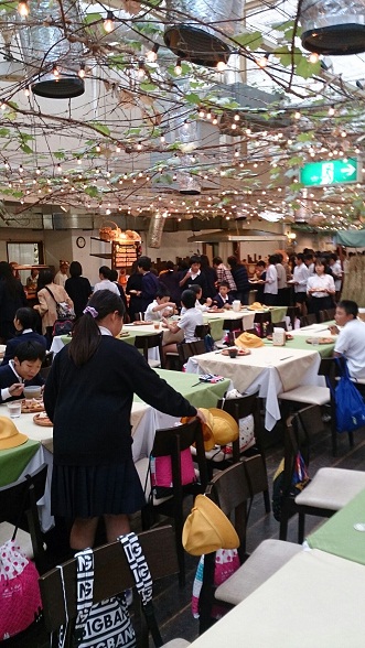 モクモクファームで班活動のあと、昼食です。メニューは、バイキングなので、自分で選んで食べます。デザートもいろいろあります。