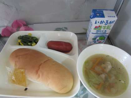本日の献立は、コッペパン、牛乳、フランクフルトのケチャップソース、スープ、三度豆とコーンのサラダ、マーマレードでした。