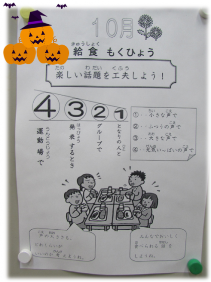 10月の給食目標です。10月の目標は、『楽しい話題を工夫しよう!』です。