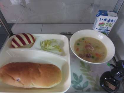 本日の給食の献立をご紹介します。本日の献立は、おさつパン、牛乳、コーンクリームシチュー、白菜のピクルス、りんごでした。
