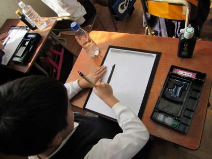 3年生の学習の様子です。1組は、毛筆書写の「日」を書く練習をしていました。(画像上・中)