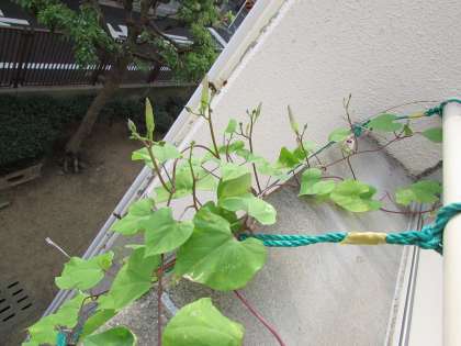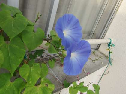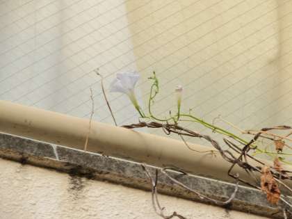東校舎の外側、1年生の教室の窓の上に、季節外れとも思えるアサガオの花が咲いています。5月の初めに種を蒔いたのですが、その後、エアコンの取り付け工事が始まり、外壁に足場を組んだために、忘れられた存在になっていました。それが、夏も終わり、秋が深まってきた今、涼しげな花を咲かせています。数は少ないのですが、空に向かってひっそりと、青い花が咲いています。それぞれヘブンリーブルー(画像上)、フライングソーサー(画像中)という名前です。つぼみもたくさんあるので、もうしばらく花の美しさを楽しめそうです。