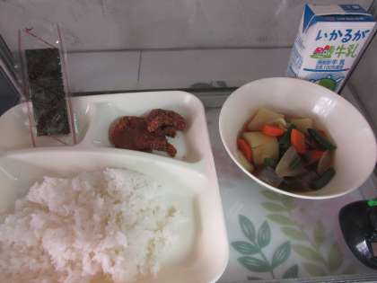 本日の給食の献立をご紹介します。本日の献立は、ごはん、牛乳、味噌カツ、じゃがいもと野菜の煮物、焼き海苔でした。
