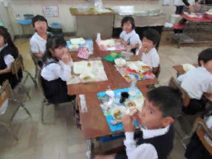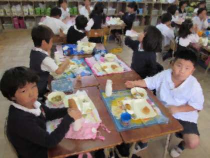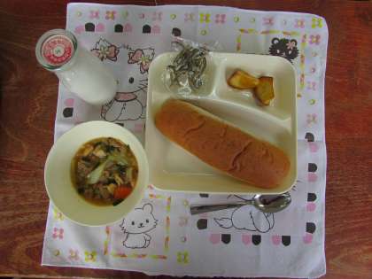 今日の給食の献立をご紹介します。今日の給食は、ライ麦パン、豚肉とイカの中華煮、大学イモ、ミニフィッシュ、牛乳でした。大学イモは、子どもたちの大好きな献立です。