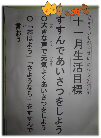 11月になりました。11月の生活目標は、「すすんであいさつをしよう」です。具体目標は、