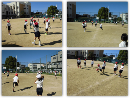 1年生の体育の学習の様子です。おにごっこなどでウォーミングアップをした後、ボール遊びをしました。