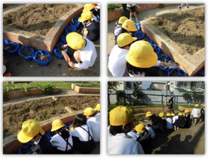 1年生の生活科の学習です。学習園に行き、鉢に土を入れ、チューリップの球根を植えました。
