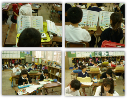 1年生の音楽の学習です。鍵盤ハーモニカで「どんぐりさんのおうち」を吹き、ドやソの位置を学習しました。