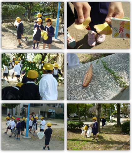 1年生は今日、田端公園へ「秋」を探しに行きました。黄色や赤、茶色の葉を見つけ、袋に入れていきました。