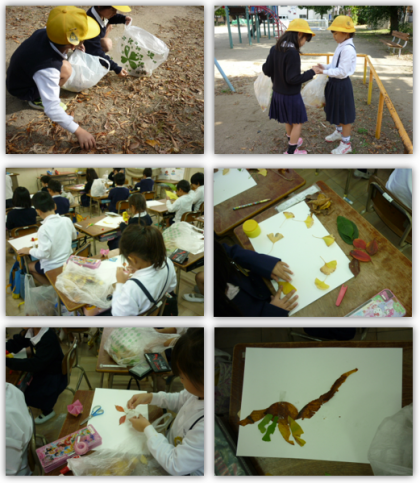 学校に帰って集めて葉っぱを画用紙に貼り付け、楽しい秋を表現しました。