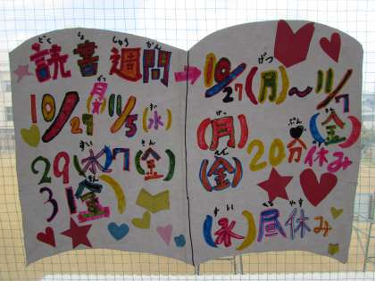 10月27日(月)から11月7日(金)までの2週間、図書委員会では、読書週間の取り組みとして、図書館開放を行います。ご家庭でも、読書の話題に触れていただけると、子どもたちの読書への関心もより高まることと思います。ご協力、よろしくお願いいたします。