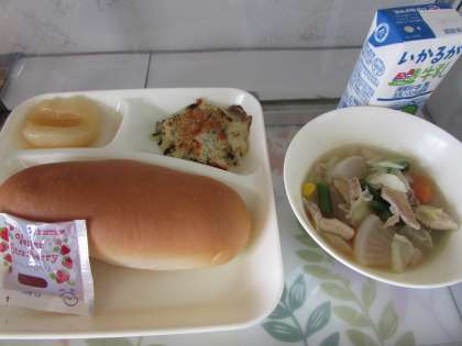 本日の献立は、コッペパン、牛乳、いちごジャム、スープ煮、ほうれんそうのグラタン、白桃(缶詰)でした。