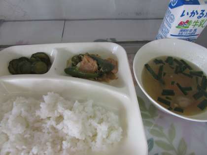 本日の献立は、ご飯、牛乳、ホイコーロー、中華スープ、きゅうりのからみ漬けでした。