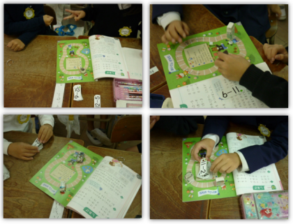 1年生の算数の学習です。ひき算の計算カードを使い、「おいこしげえむ」に取り組みました。