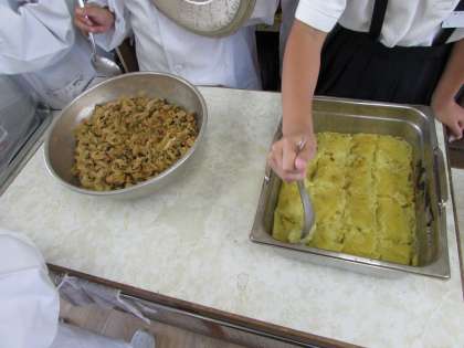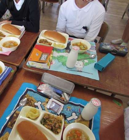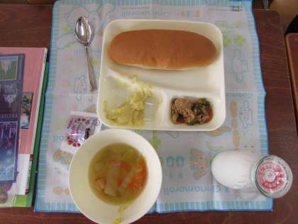 本日の給食の献立をご紹介します。今日の給食は、コッペパン、いちごジャム、豚肉と野菜のケチャップソテー、白菜のスープ、スイートポテト、牛乳でした。秋の味覚の代表、サツマイモ。今日の給食のスイートポテトも、甘くてとってもおいしかったです。