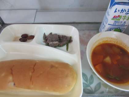 本日の献立は、おさつパン、牛乳、牛肉の香味焼き、ケチャップ煮、うずら豆のグラッセでした。
