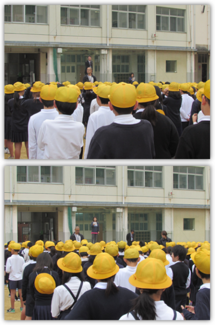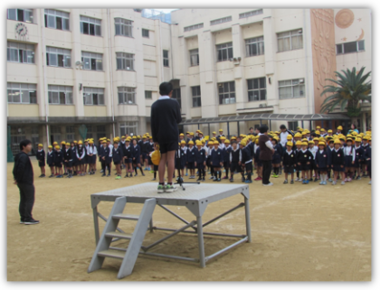 初めに、学校長から「季節が進んできました。他の学校で、インフルエンザによる欠席が出てきているようです。今週の土曜日は、学習発表会です。風邪などひかないよう、手洗い・うがいをし、汗をかいたらしっかりと拭くよう、努めましょう」と、話をしました。また、先日住吉区で起きた事件を念頭に、スマホなどでSNSを利用している人は、使い方を確かめ、おうちの人と使い方について話をしましょう、と話しました。