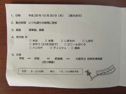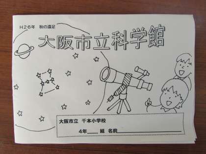 明日10月30日(木)、4年生の秋の遠足です。大阪市立科学館へ行きます。雨天決行です。普段通りの時間(8時10分〜8時25分)に登校しましょう。