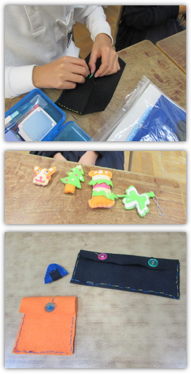 5年生の家庭科の学習です。フェルトを使い、ティッシュペーパー入れやペンケースなどの小物を作りました。