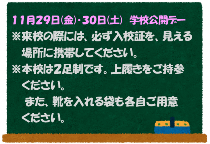 本日11月29日と、明日11月30日は、学校公開デーとなっています。ぜひお越しいただき、子どもたちの学校生活の様子をご覧ください。