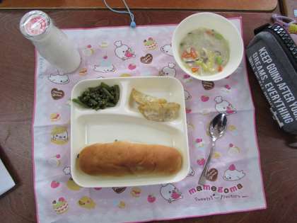 本日の給食の献立をご紹介します。今日の給食は、レーズンパン、白菜のクリーム煮、揚げ餃子、中華和え、牛乳です。